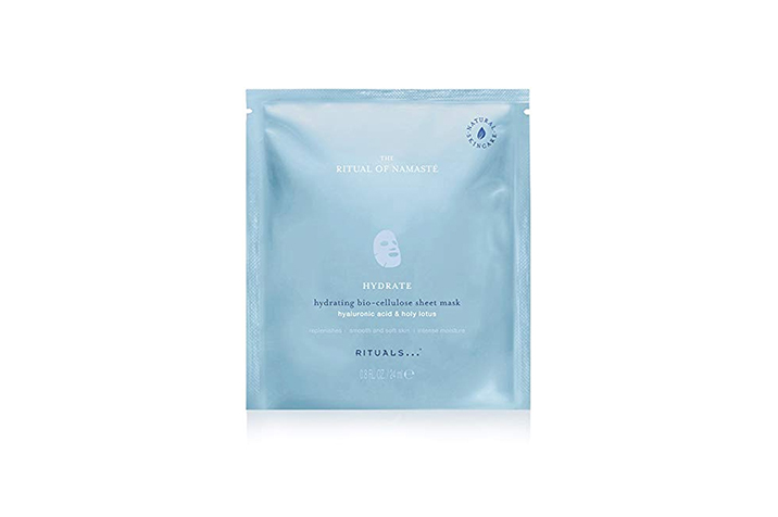 Rituals The Ritual of Namaste Hydrating Sheet Mask – makkelijk te vinden bij Douglas of ICI PARIS XL, geeft een onmiddellijke glow dankzij hyaluronzuur en lotus-extract.