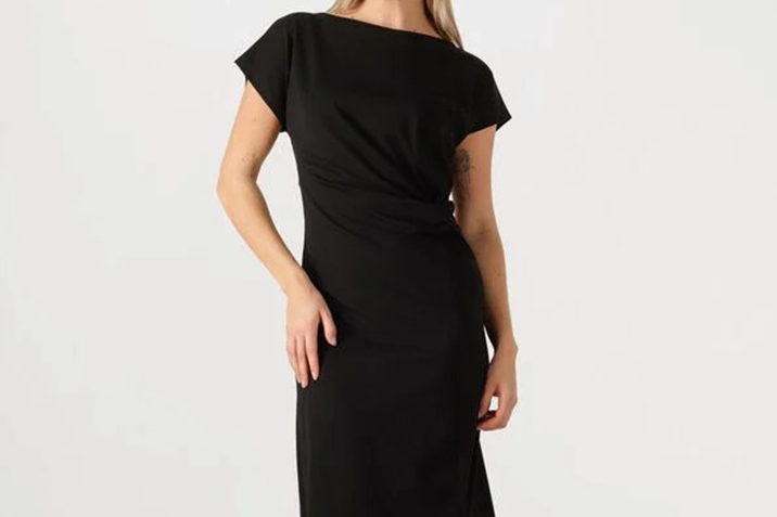 Een zwarte midi-jurk van Selected Femme kan overdag met sneakers en een denim jasje gedragen worden, en ’s avonds met hakken en gouden sieraden naar een diner.